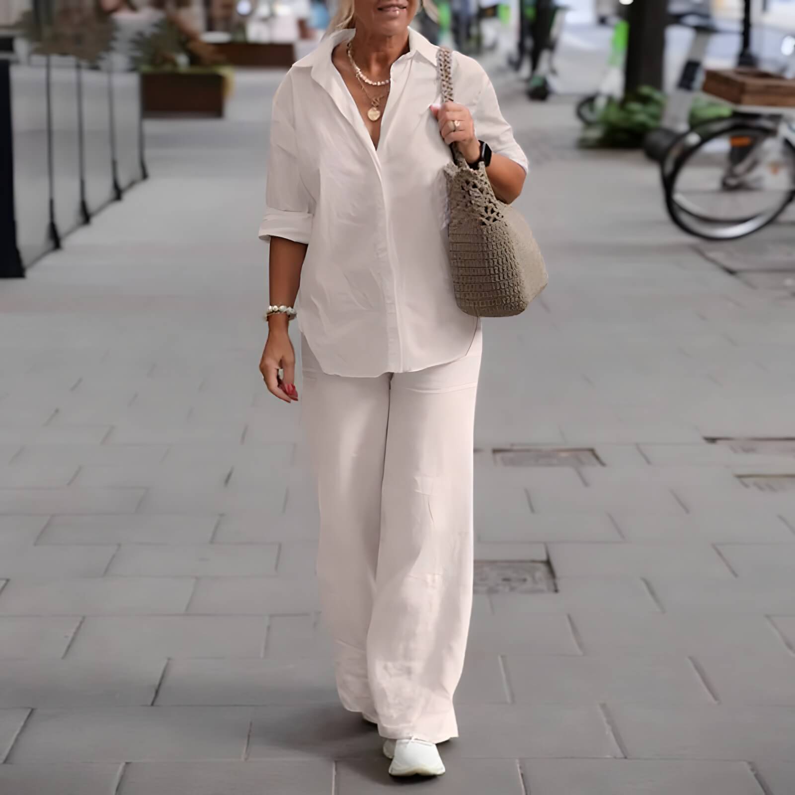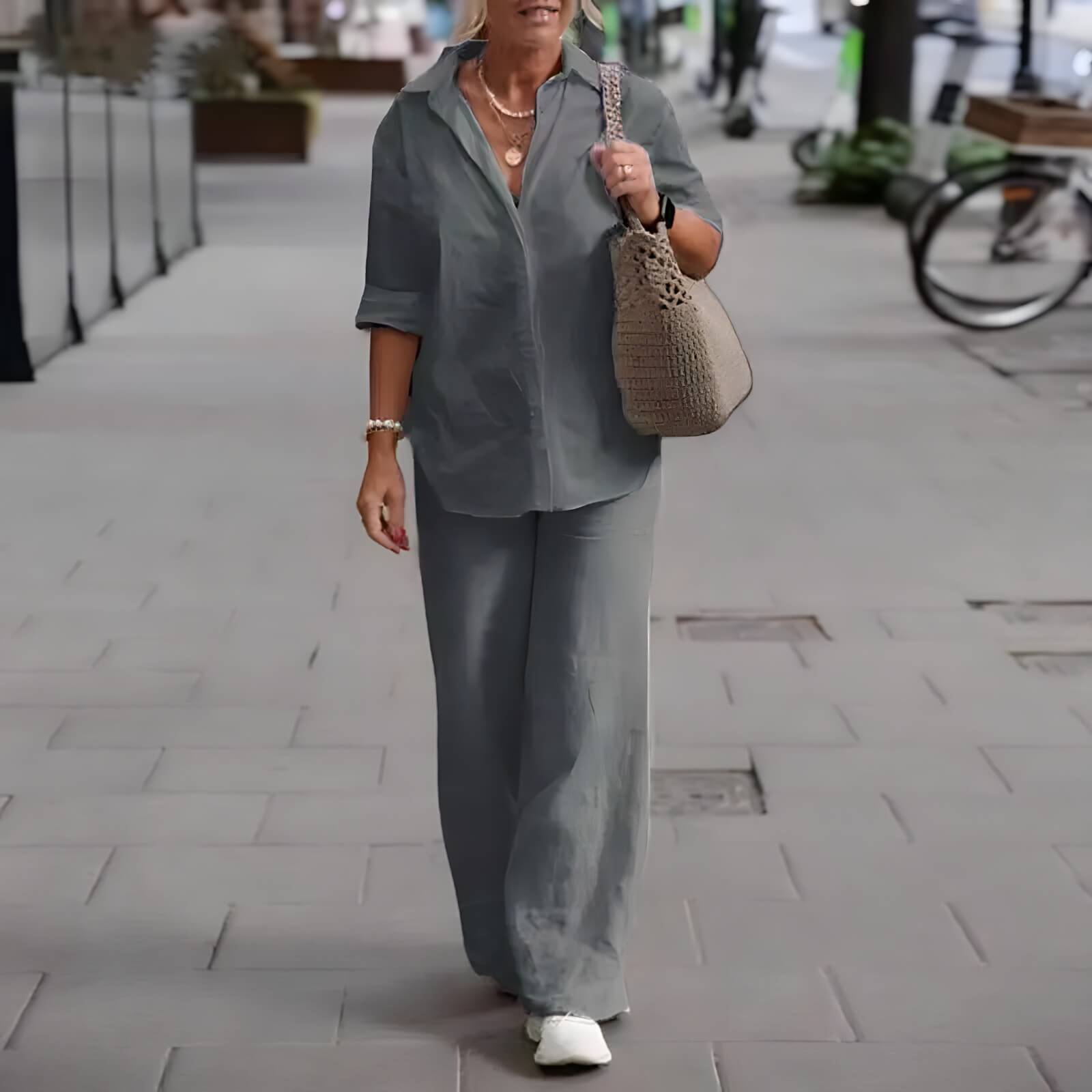 • Bas : pantalon fluide, longueur cheville, taille élastique confortable